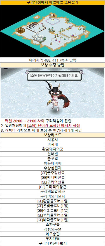 ▷ 이벤트 기간 동안 구리댁섬(야외지역 488, 411 /속초 남쪽)에 찾아가 일반채팅창에 일 1회 [소원] 단어를 포함해서 문장을 작성하면 특정 보상 중 1개를 획득할 수 있습니다.