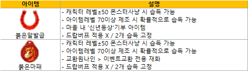 ▷ 기부에 필요한 ‘붉은말발굽’아이템은 캐릭터레벨 +-50몬스터 사냥 (드랍버프 적용X) / 아이템레벨 70 이상 제조 시 확률적으로 습득이 가능합니다.